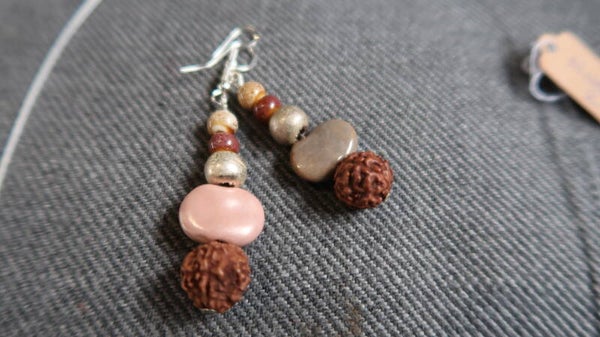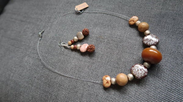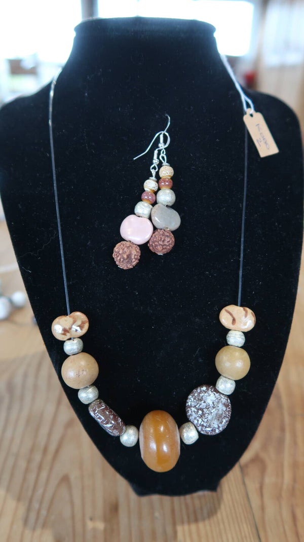 Le collier Kobo est monté sur un fil transparent souple d'environ 16 à 17 cm de diamètre. Il se compose d'une perle centrale en ambre brun, de perles Kazuri plates dans les tons brun:beige, de petites perles en ambre brun, de perles de prière rhudrashka brunes et de petites perles éthiopiennes.