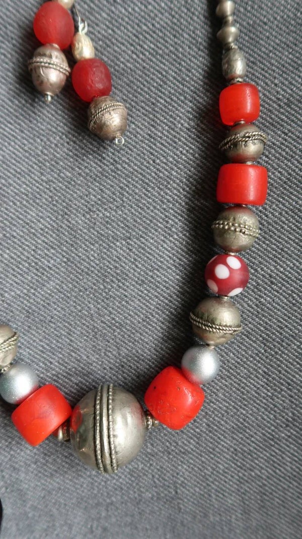 C’est un très beau collier d’aspect traditionnel, il est composé de perles de verre rouges, de perles heishi, de perles anciennes éthiopiennes en argent / métal, de perles de verre pointillées rouge recyclées du Ghana, de deux perles argentées en bois etc.