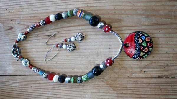 Il a un grand pendentif en argile rouge, fait à la main en Éthiopie, et les perles proviennent de verre recyclé du Ghana, de vieilles perles de verre véniciennes, de perles de lave, d’os, de perles de verre Krobo du Ghana et de perles d’argent filigrane, de longues perles de tunnel tibétaines.