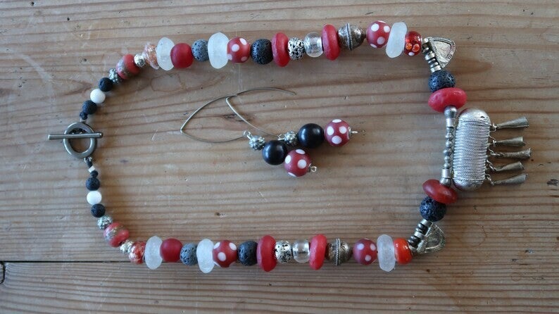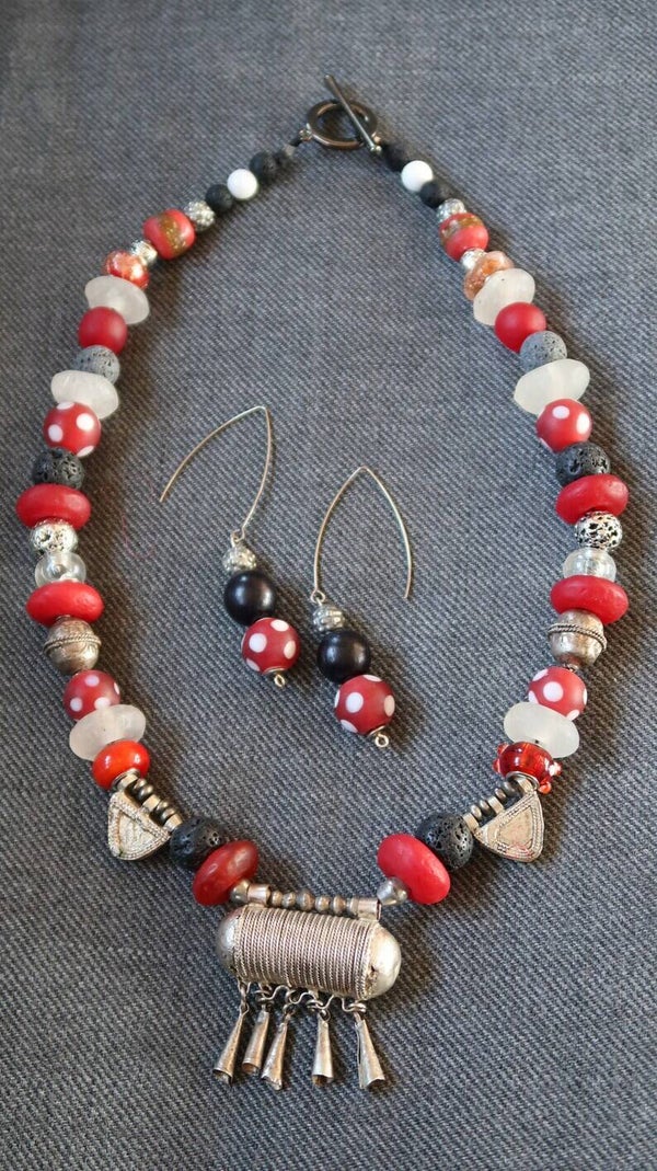 Il est très beau et composé de beaucoup de perles différentes : un pendentif traditionnel éthiopien en métal / argent, des perles d’argent éthiopien, des perles yoruba du Nigeria, des perles de telsum, des perles de verre recyclées, des perles pointillées en verre blanc/rouge, différentes perles de lave en noir, gris, et une perle de lave avec une couche d’argent.