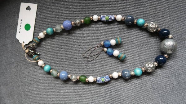 Ayana est un collier dans les tons bleu/vert/gris, avec des perles Kazuri du Kenya, une grosse perle centrale argentée mate, des perles éthiopiennes martelées, des perles Krobo, des perles en os et en bois.